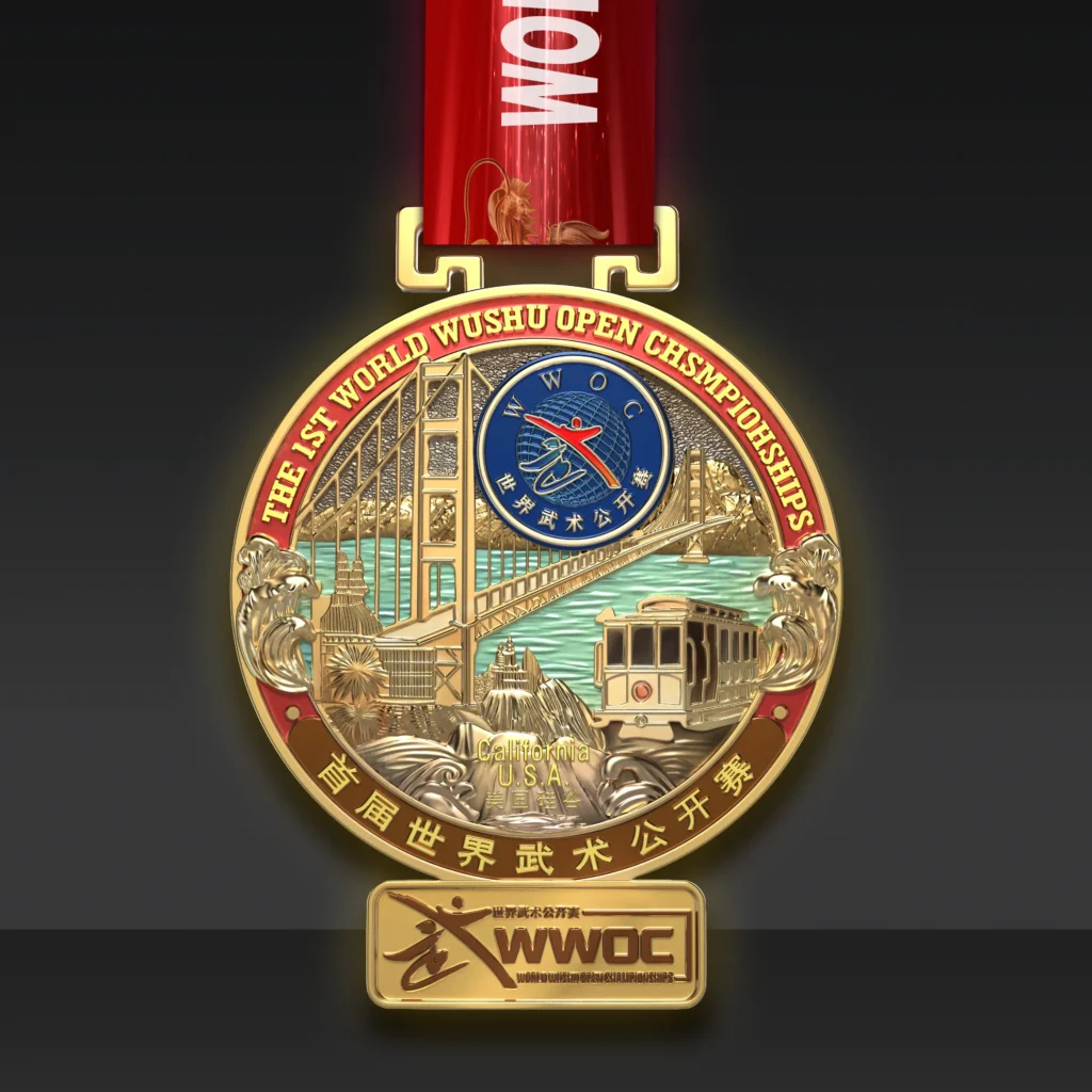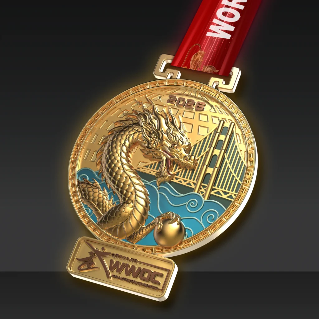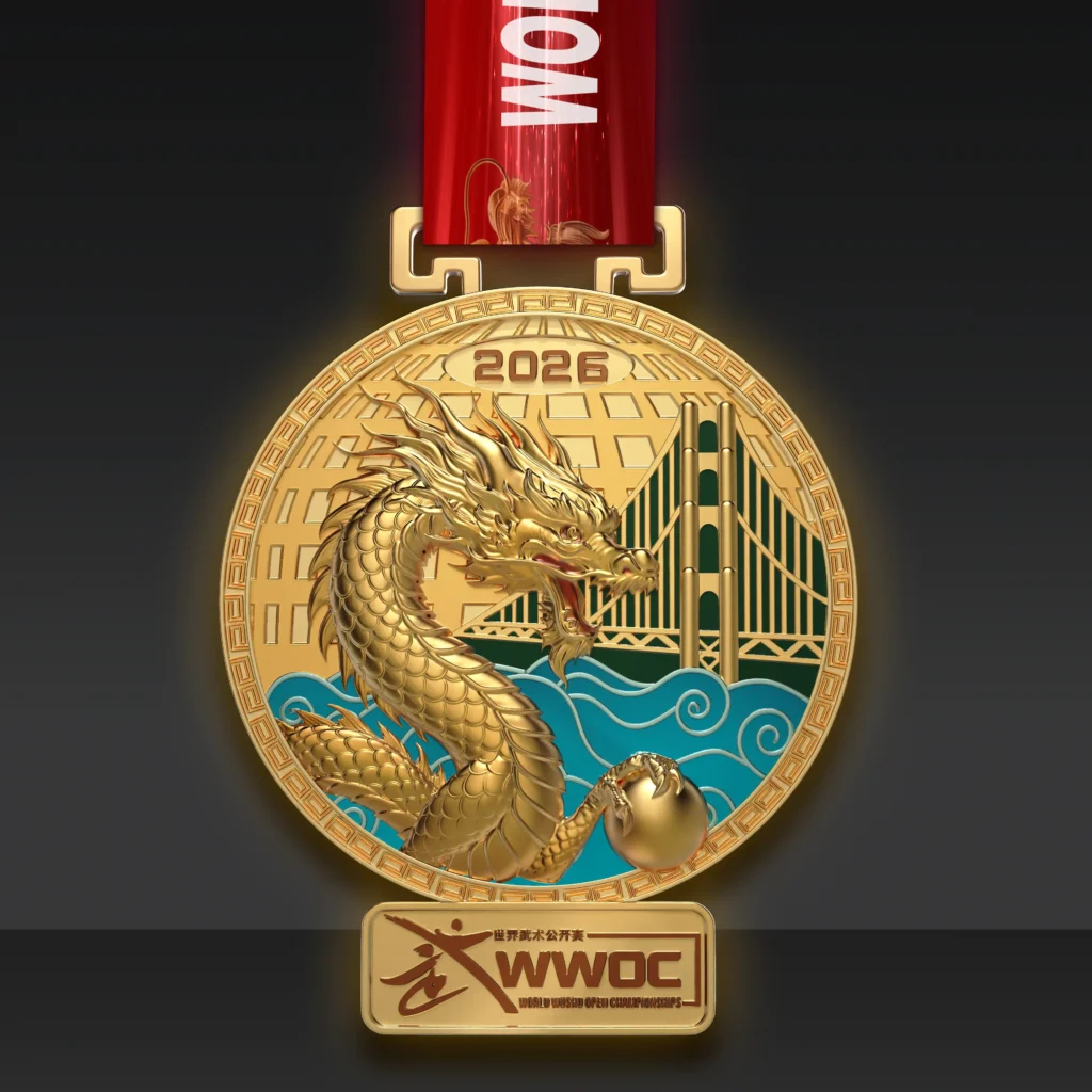 The Supreme Golden Dragon Award represents the highest honor of the 2026 World Wushu Open Championships (WWOC). This prestigious medal features a magnificent golden dragon rising powerfully above waves with the iconic Golden Gate Bridge in the background.