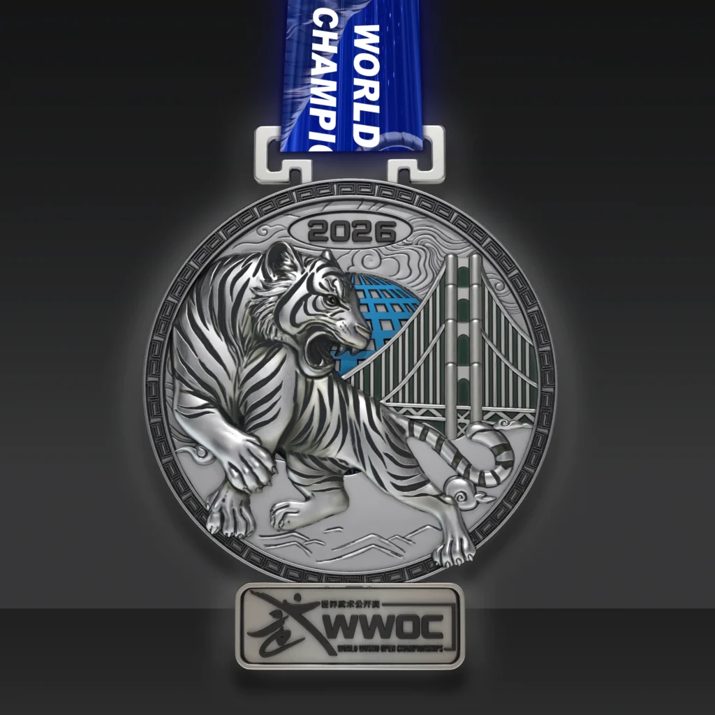 The Vibrant Silver Tiger Award represents the silver medal of the 2026 World Wushu Open Championships (WWOC). The front of the medal features a powerful and dynamic white tiger, rendered in detailed metal relief. Its sharp, flowing stripes and poised stance embody the essence of martial arts—strength, agility, and explosive energy.